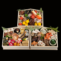 ミシュラン二つ星「美山荘のおせち」。地元で採れる山の恵みや、魚介を用いた逸品揃い。2段重は3人前・45品目です。