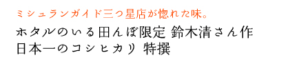 ミシュラン2つ星、美山荘御用達のお米「金賞受賞 鈴木和夫さん作 減農薬・有機質肥料100%のお米」。ただ今特別価格でご提供しています。 |