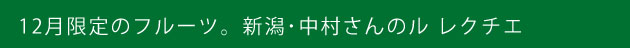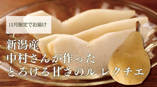 ラ・フランスを超える甘さの芳醇な香りの西洋なしです。「新潟産 中村さんが作ったとろける甘さのル レクチエ」は5玉(1玉500g以上)と、6玉(1玉430g前後)の2種をご用意しました。12月上旬より発送する予定です。 |